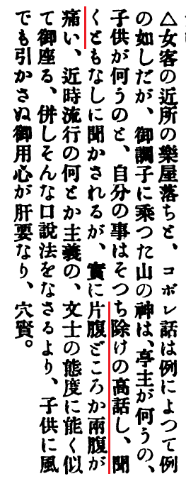 内容は一切頭にはいらなかったが、「両腹痛い」というのはおもしろいしゃれだな、と思った。「傍ら痛い」から「片腹痛い」を経て「両腹痛い」とは、掛け違った道を順調に進んでいるようだ。