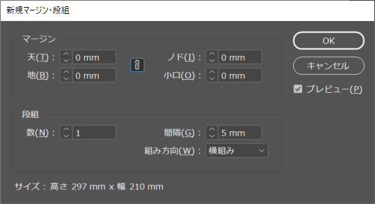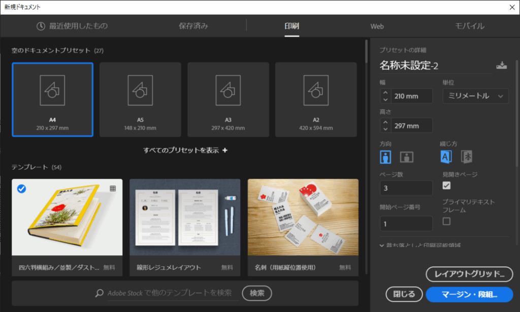 ここではA4サイズで作成します。他のサイズでも手順は変わりません。ページ数を3にして、「マージン・段組」をクリックして次に進みます。ページ数を変更し忘れても、後で追加すれば問題ありません。