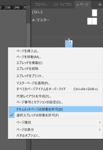 「ページパネル」でページを選択後(どのページでもよい)、右クリックメニューで「ドキュメントページの移動を許可」のチェックを外します。